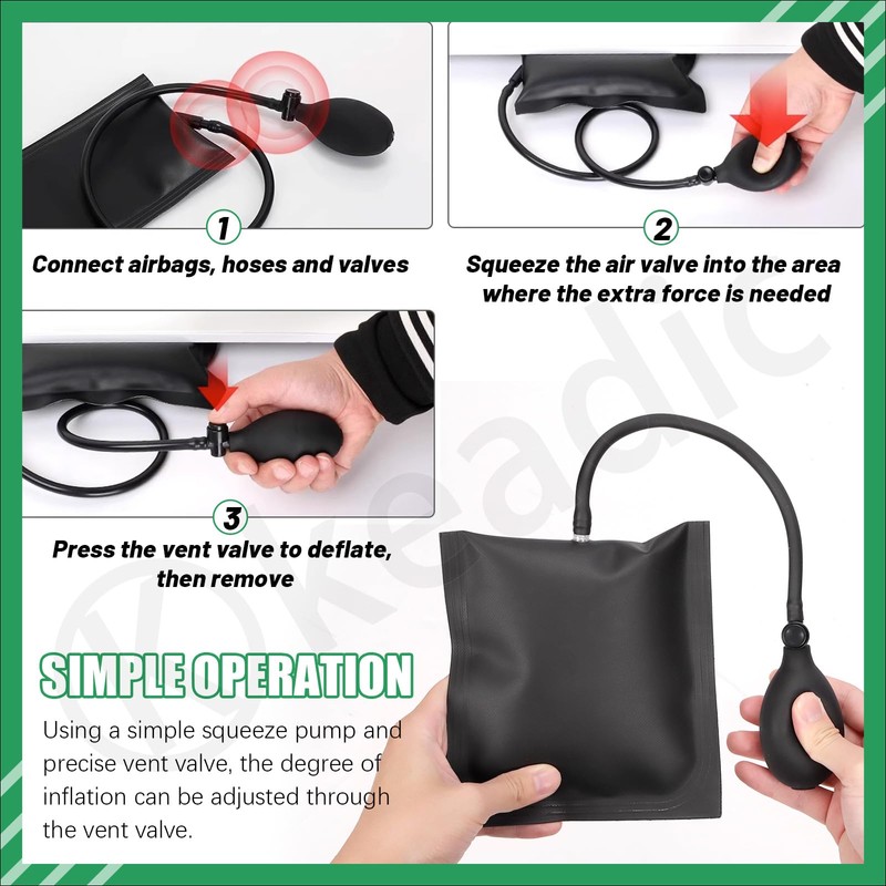 - Easy to use: air wedge bag pump is easy to use. First, connect airbags, hoses and valves. Secondly, press the air valve into the area where the extra force is needed. Finally, press the bleed valve to put down, then remove. Work done!