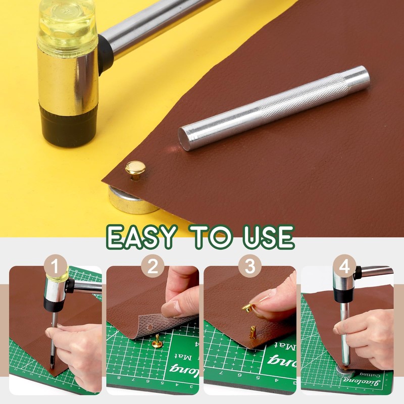 - 【How to Use】 Step 1: You need to use the hole punch to punch the holes in leather or fabrics. Step 2: Place the snap on the base and through the hole you just punched in the leather or fabric. Step 3: You'll need to snap the other part on and place it on the base, making sure the tool bar is aligned with them both. Step 4: Then with a gentle tap, the rivets on one side are installed! The other side is installed the same way as this one.