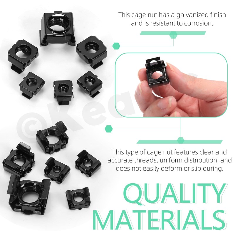 Square cage nuts are made of carbon steel, black zinc plated surface, anti-corrosion and anti-rust, high hardness, not easy to deform. ◎ Easy to Install: Cage nut threads are clear and accurate, providing you with a smooth and satisfying installation process. ◎ Easy to store: Comes with a transparent case for easy to store and carry, bringing convenience for your life. ◎ Wide Application: Cage nuts kit are widely applied for switches, routers, mounting servers, rack shelves, electronic, and data equipment. ★ Package Included: 14Pcs ---------M4 Black Snap-in Cage Nut 14Pcs---------M5 Black Snap-in Cage Nut 14Pcs---------M6 Black Snap-in Cage Nut 14Pcs---------M8 Black Snap-in Cage Nut 14Pcs---------M10 Black Snap-in Cage Nut 14Pcs---------M12 Black Snap-in Cage Nut Totally 84Pcs