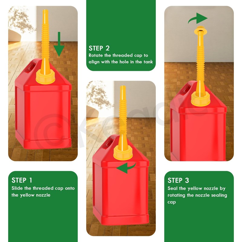 • 【Leak-proof Design】 The end of the nozzle is designed with threads to make the cap screw on tighter without leaking easily. The rubber gaskets inside every spout cap are thicker and widened design, which can better fit the gasoline container and prevent liquid spillage. You just make sure the nozzle cap is tight and the tank won't leak. It will not leak even if the tank is filled during transport.