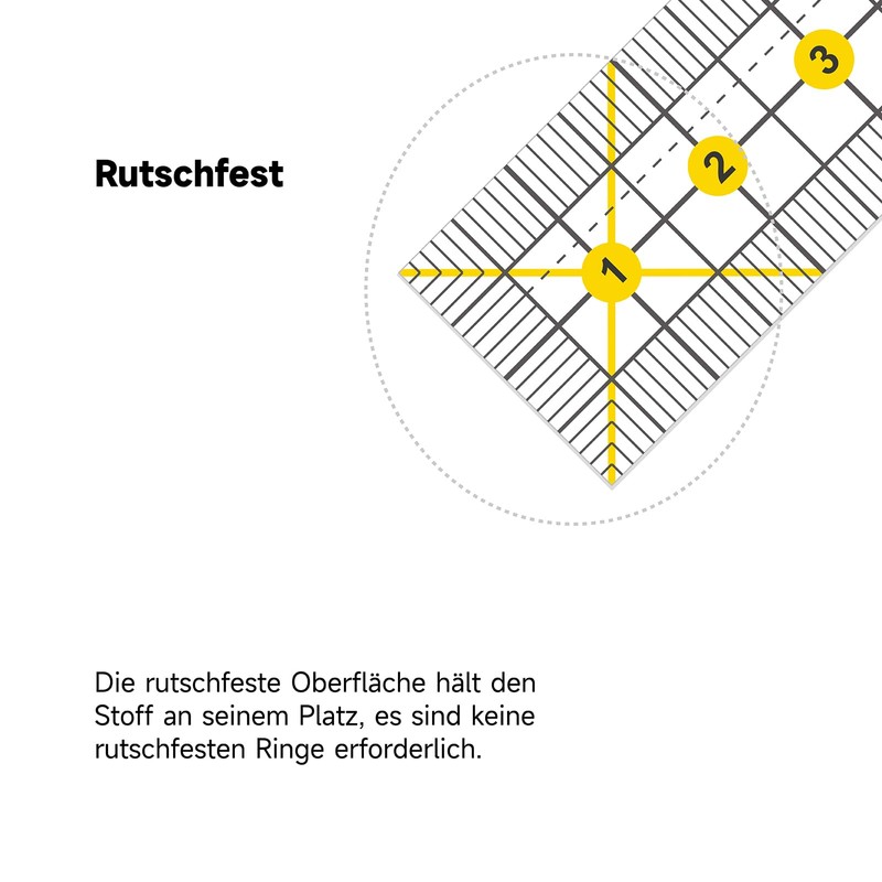 - No non-slip rings required: the back of the ruler is non-slip and keeps the material in place.