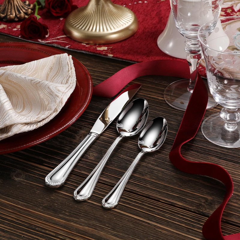 • 💎Elegant Design: The set boasts a timeless bead design on both sides and a brilliant mirror finish, adding a touch of sophistication to any table setting. The pearled edge enhances the elegance, making it perfect for both formal dinners and casual meals.