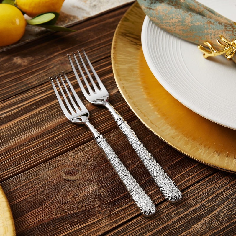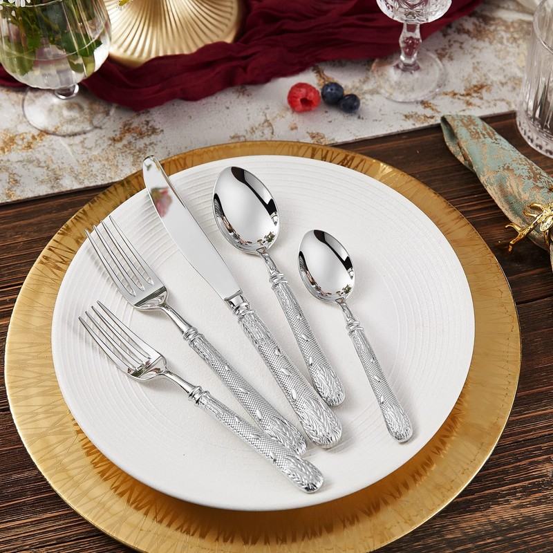 - Exquisite Royal Engraving with Wheat-Inspired Detail: Each piece in this silverware set features a refined handle with classical wheat-style embossing—sculpted with depth and elegance to bring timeless detail to your formal table. 💎The Premium Versailles 20‑piece set serves 4 (dinner fork, salad fork, dinner knife, dinner spoon, teaspoon). 💎 The 45‑piece serves 8 and adds a 5‑piece hostess set. 💎 The 65‑piece serves 12 and also includes the same 5 hostess pieces.