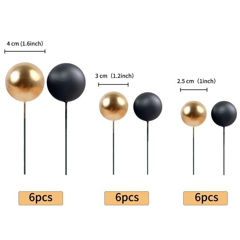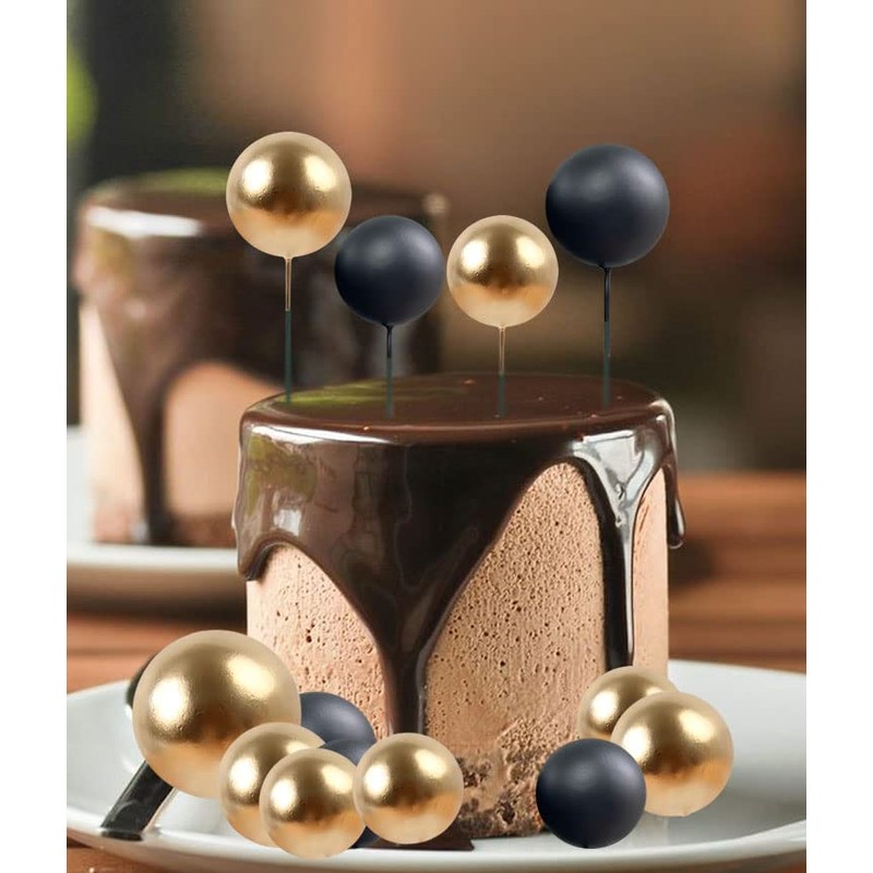 Keaziu Paquete de 36 adornos para magdalenas, bolas de perlas para tartas, decoración para tartas, bola de espuma, palillos para cupcakes, mini globo para boda, baby shower, aniversario, fiesta de cumpleaños, suministros dorado y negro