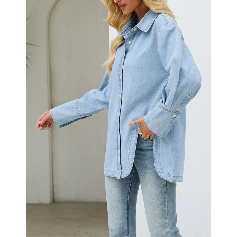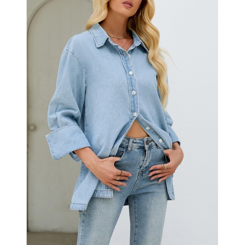 Whether you're grabbing coffee on a slow spring morning, exploring weekend markets, heading to brunch, or layering up for a chill day at work, this women's denim shirt fits right in. The oversized fit makes it perfect for pairing with leggings or skinny jeans, while the curved hemline adds a modern twist to the classic denim button-up shirt women love. Wear it fully buttoned as a denim top, leave it open over a tank as a casual denim shacket for women, or tuck one side for a laid-back, fashion-forward vibe.