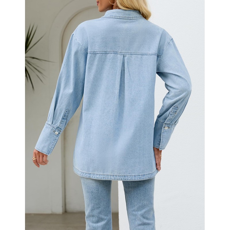 Designed with a traditional collared neckline, full button placket, and long sleeves with adjustable cuffs, it functions as both a chambray shirt for women and an oversized jean jacket depending on how you style it. It's easy to layer with midi skirts, denim shorts, or wide-leg trousers — and yes, it’s even bump-friendly for expecting moms looking for breathable, stylish maternity layers.