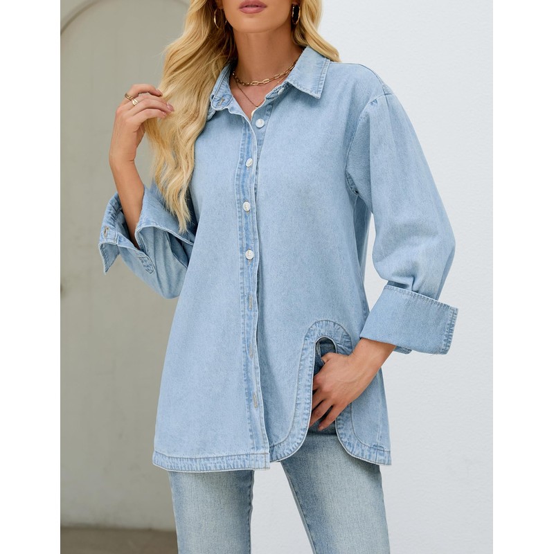 - Unique Asymmetrical Hem Design: Elevate your everyday denim with a curved, asymmetrical hem that adds subtle flair to a timeless silhouette. It’s the kind of detail that takes a basic denim shirt to an effortlessly cool statement piece