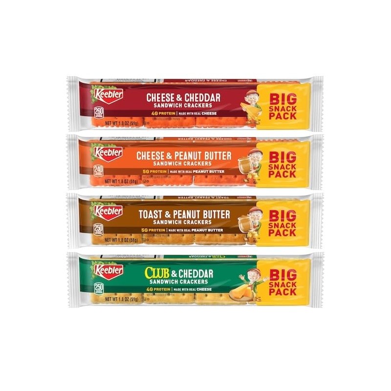 KEEBLER SANDWICH CRACKERS VARIETY PACK: Enjoy four delicious flavors in one bundle—Cheese & Cheddar, Cheese & Peanut Butter, Toast & Peanut Butter, and Club & Cheddar—perfect for satisfying a variety of cravings.