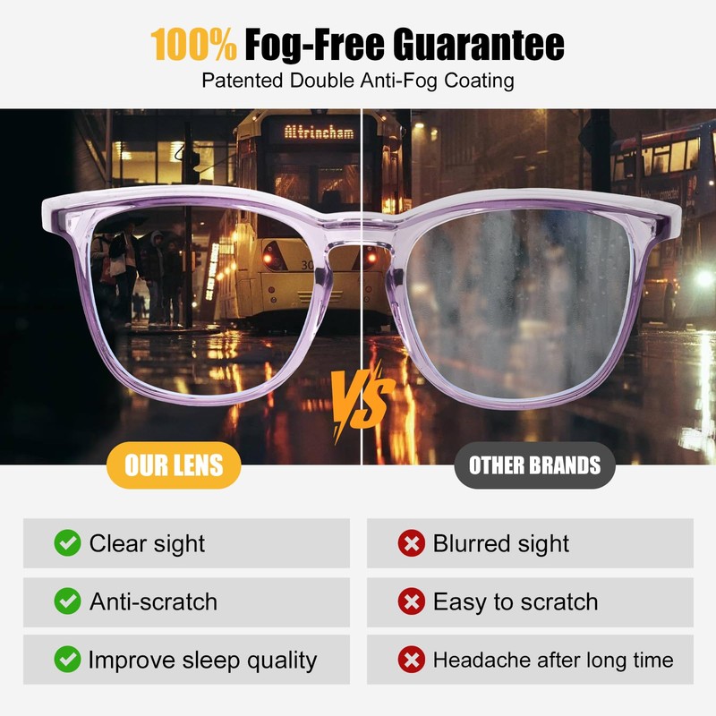 - Anti-Fog and Blue Light Blocking: Dual-sided anti-fog coating ensures clear vision even with masks, while blue light filtering technology reduces harmful emissions from screens and fluorescent lights, alleviating eye strain during prolonged use, UV400 protection ensures all-day eye protection glasses performance.