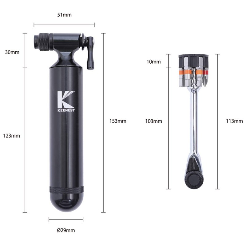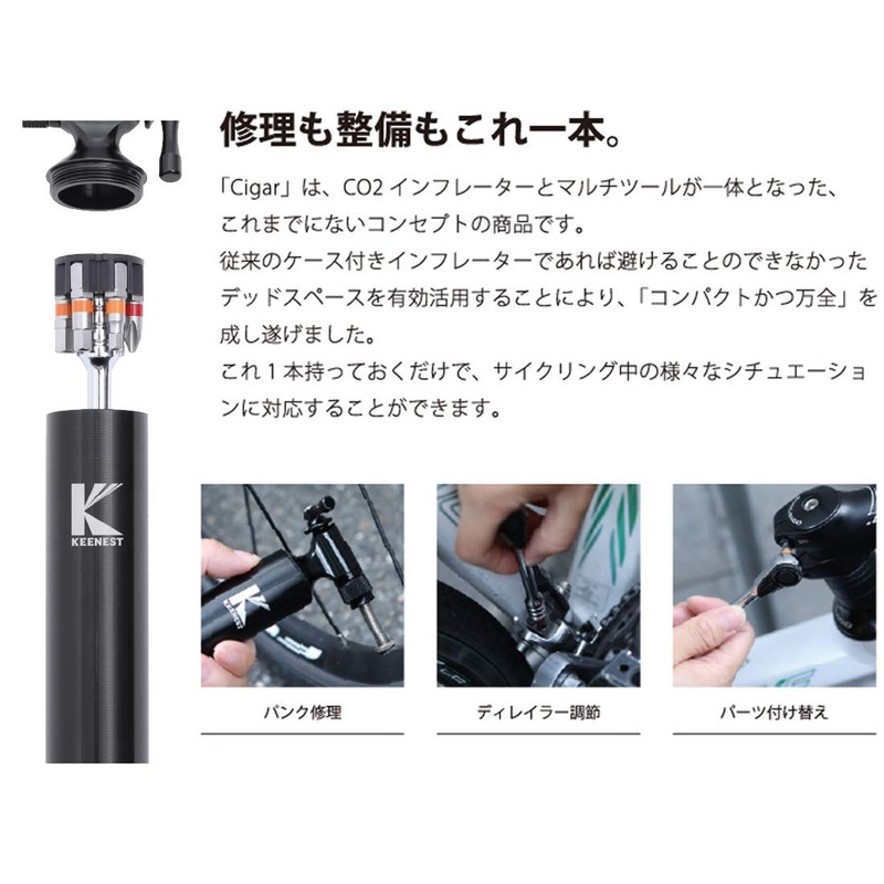 KEENEST Bicycle Air Pump, Cigar CO2 Inflator & Tool Set, CO2 Cylinder, Compact Size, Compatible with Road Bikes, Presta and American Valves, 0.4 oz (12/16/20/25 g) Cartridges (Can be used with Small Diameter Vehicles such as Mini Velos Without Problems)