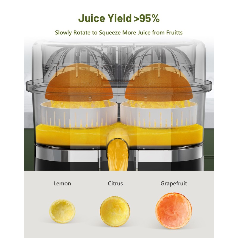 - Powerful Dual-Head Citrus Juicer: The dual-head juicer improves the efficiency of juicing; It can also squeeze two kinds of fruits at the same time to make mixed juice. Making of a delicious juice won't bring absolutely any inconvenience. 90W powerful motor extracts juice fully & works in silence. It'll help you to live a healthier life.