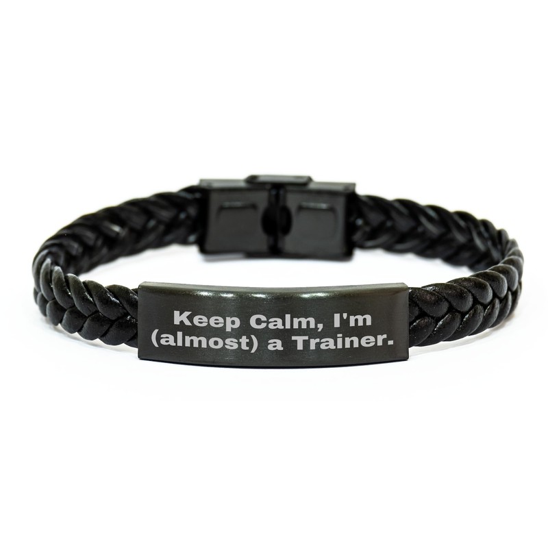 - Give the gift of motivation with our Keep Calm, I'm (almost) A Trainer. Braided Leather Bracelet, perfect for any Trainer who loves fitness. Show them that you believe in their fitness journey and that they're almost a Trainer. Don't miss out and make their day!