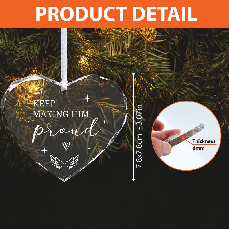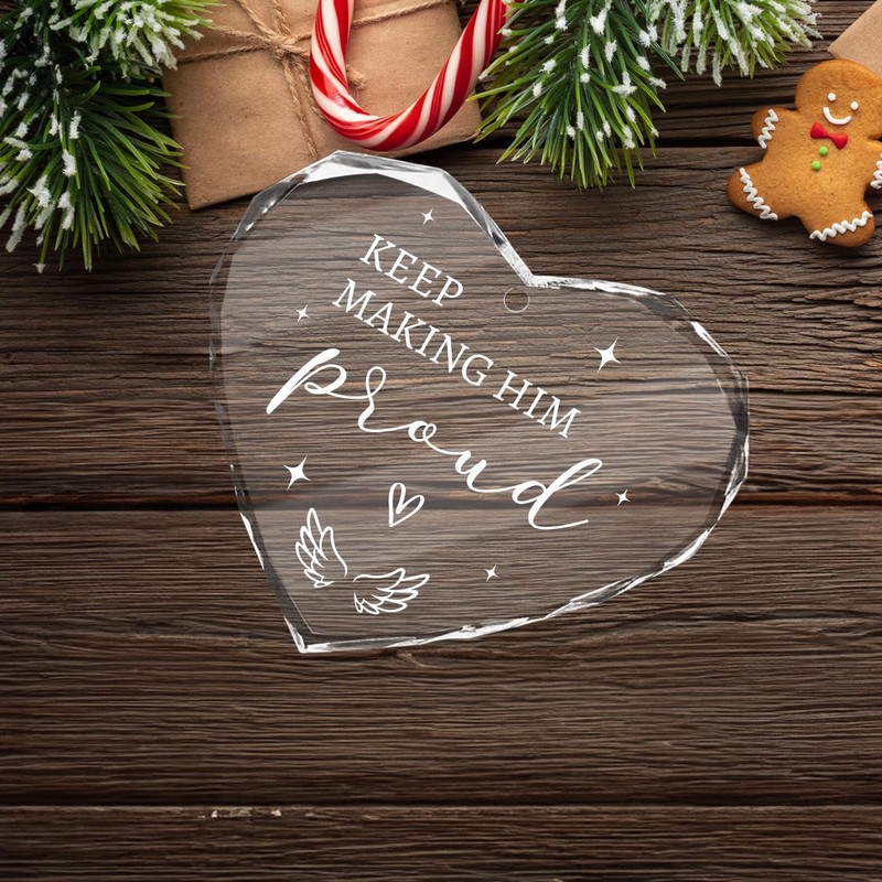 Honor the memory of a loved one with our "Keep Making Him Proud" glass memorial ornament. This heart-shaped ornament serves as a beautiful reminder to continue living in a way that would make her proud. Crafted from high-quality glass, it adds an elegant touch to any Christmas tree or memorial display. This keepsake is perfect for those looking to cherish and remember someone special during the holiday season and beyond.