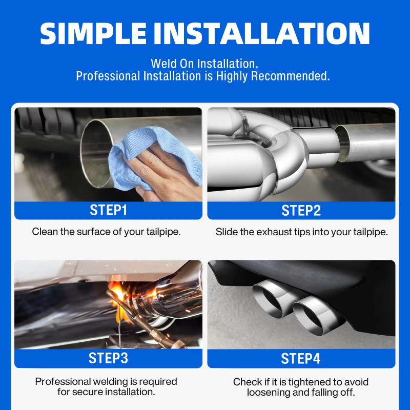 Maintenance tips: please routinely clean off the debris, cement, oil, dust and dirt on the surface or the interior of the exhaust tips since good maintenance ensures a longer service life of exhaust tips (NOTE: Professional installation would be highly recommended)