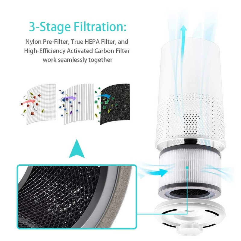 - 3-Stage Filtration: Nylon Pre-Filter, True HEPA Filter, and High-Efficiency Activated Carbon Filter work seamlessly together to eliminate pet dander, smoke and so on