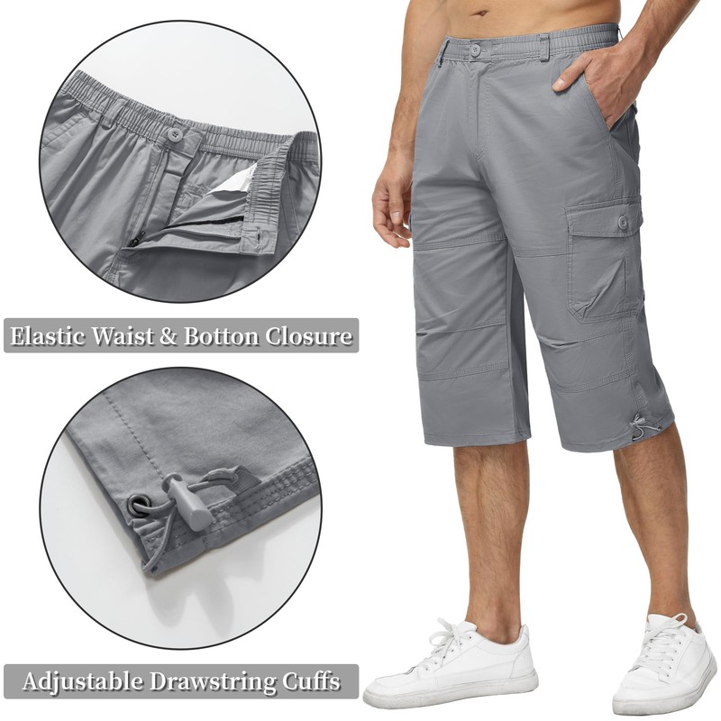 KEFITEVD 3/4 Length Mens Shorts Baggy Cargo Work Shorts Elastic Waist Long Capri Shorts,Light Grey,34