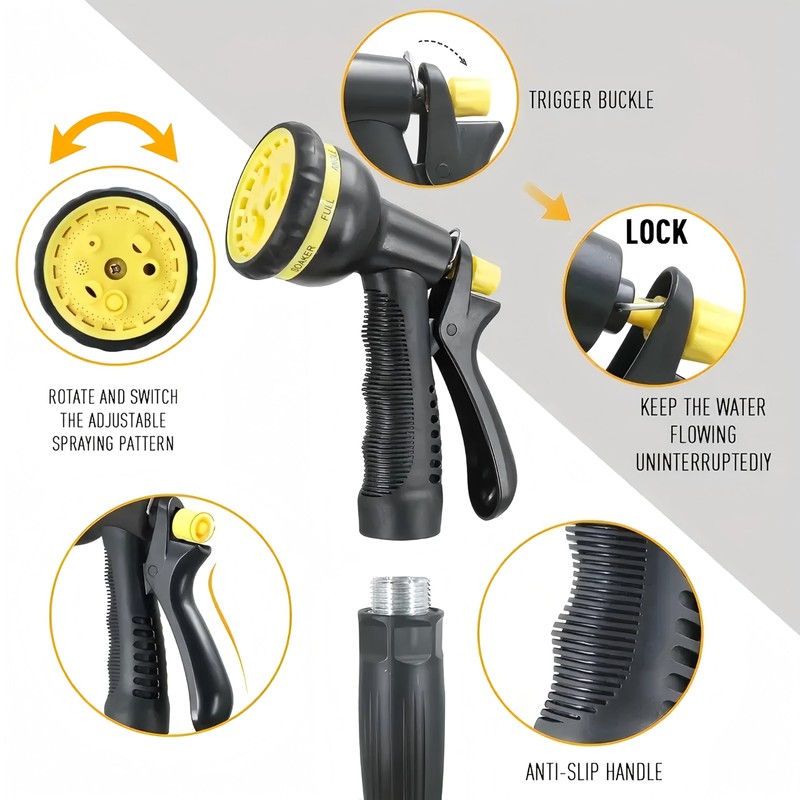 - Multi-Function Nozzle for Every Task: Outfitted with an 8‑pattern spray nozzle, this 50 ft hose handles all your watering and cleaning jobs with ease. Its standard 3/4″ connector fits most faucets securely, preventing leaks and maintaining steady pressure.
