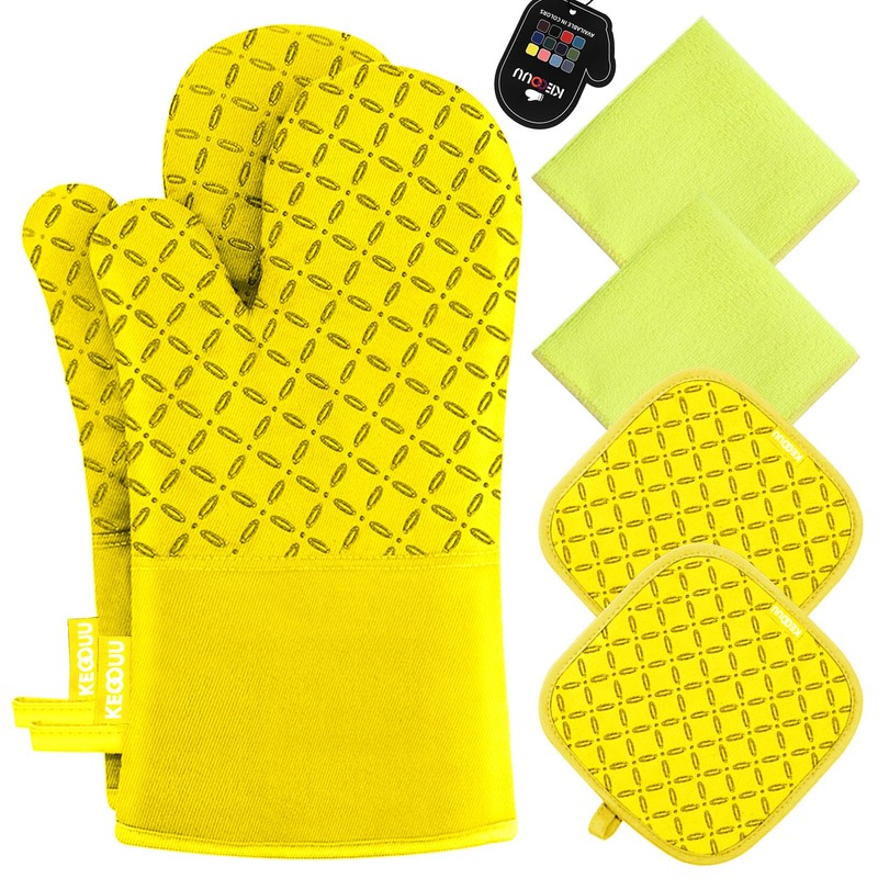 KEGOUU Oven Mitts and Pot Holders 6pcs Set, Kitchen Oven Glove High Heat Resistant 500 Degree Extra Long Oven Mitts and Potholder with Non-Slip Silicone Surface for Cooking (Yellow)