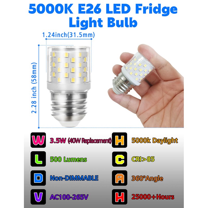Kei D34l 5304511738 3.5W Refrigerator LED Light Bulb 40W Equivalent, Daylight White 5000K E26 Fridge Light Bulb, LED Bulb E26 Medium Base Fridge Freezer Appliance Ceiling Fan Lighting 2pack, 500lm