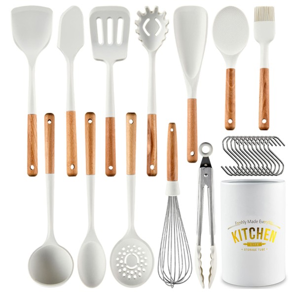 - PROFESSIONAL SILICONE KITCHENWARE SET: Our kitchen utensil set includes Spatula, Spatula, Spoon, Big Colander, Noodle Fishing, Flat Spoon, Duckbill Shovel, Rice Spoon, Scraper, Brush, Egg Beater, Food Clip and Storage Bucket. Match your dishes with 12 different tablewares to make cooking easier.