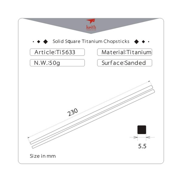 - Keith Titanium Ti5633 Solid Square Handle Chopsticks are made of premium pure titanium grade 1 without lining and coating. Their square handles are stylish, easier to grip and help to prevent chopsticks from rolling on table and falling onto floor. They are tasteless, odorless, non-toxic and dishwasher safe. They are great for backpacking, camping, traveling, picnicking, emergency prepping and around the home and office. Each pair comes with an aluminum case.