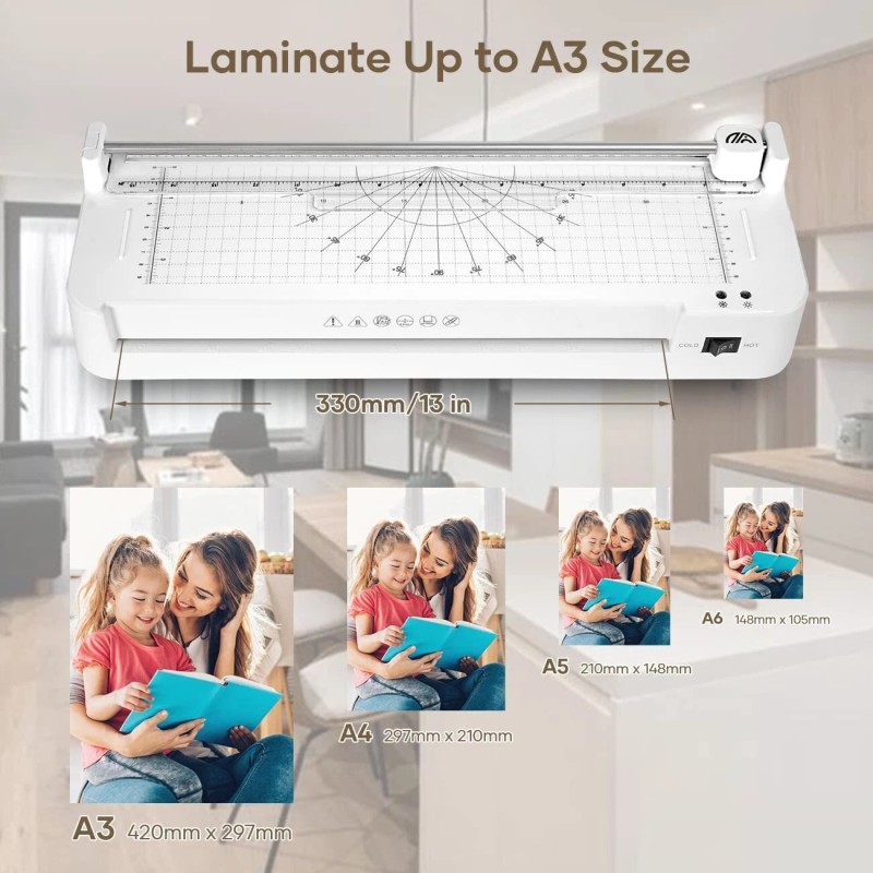 - Basic Lamination Kit】This 13 in laminator comes with the most useful accessories: paper cutter, corner rounder, and 50 hot laminating pouches (10 A3/A4/A5, 20 A6) to meet everyday demands.