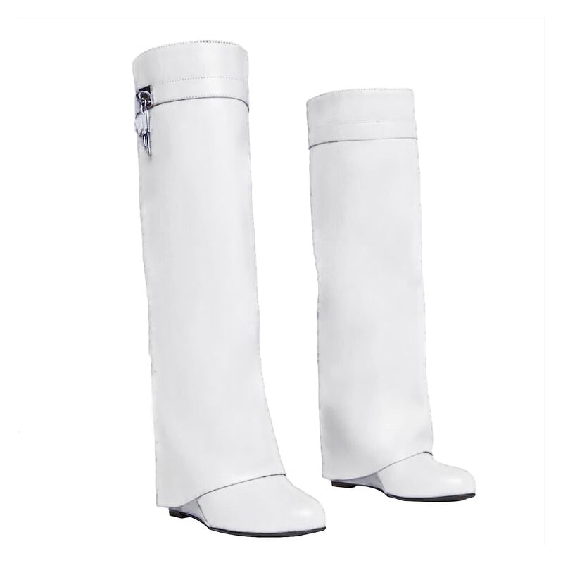 keleimusi Fold Over Wedge Boots Heeled PadLock Pant Knee High Shoes Tall/Short Booties in White