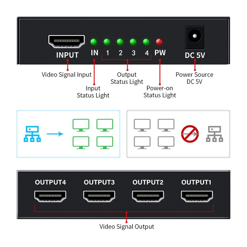 - 【1x4 Hdmi Splitter】This Hdmi splitter 1 input 4 output duplicate 1 HDMI input signal to 4 identical HDMI output signals, transmit video and audio simultaneously without any quality loss. ✅ NOT hdmi switch 4 input 1 output, can't switch 4 signal source on one display.