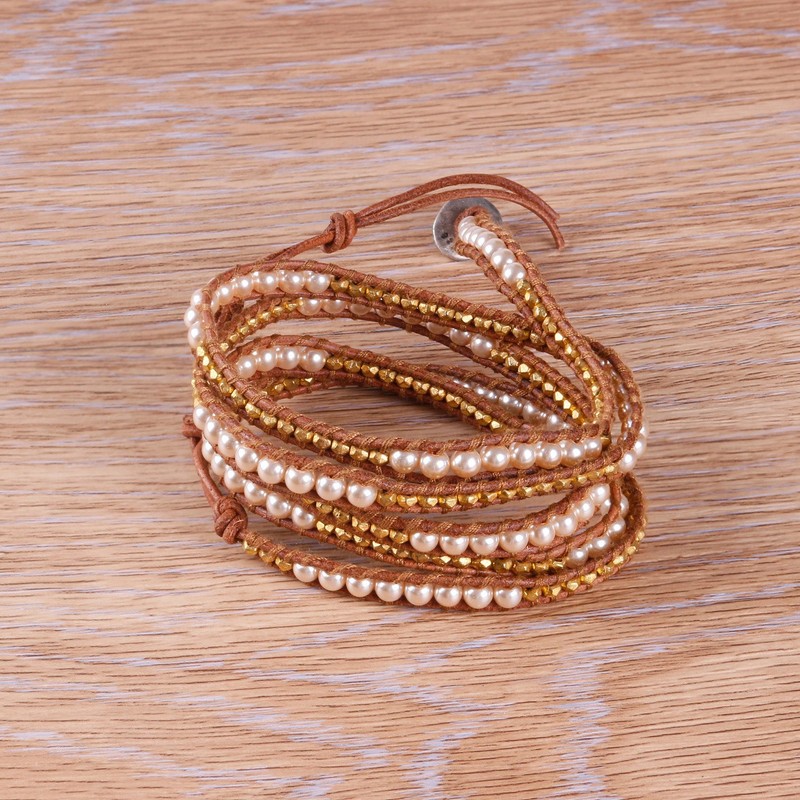 KELITCH Imitation-Pearl and Gold-Plated Metal Nugget Bead 5 Wrap Bracelet on Brown Leather