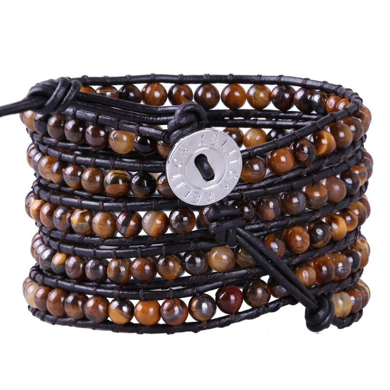 KELITCH Synthetic Tiger Eye Gems Beads 5 Wrap Bracelet Leather Handmade Strand bracelet