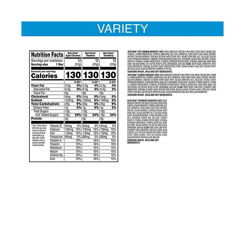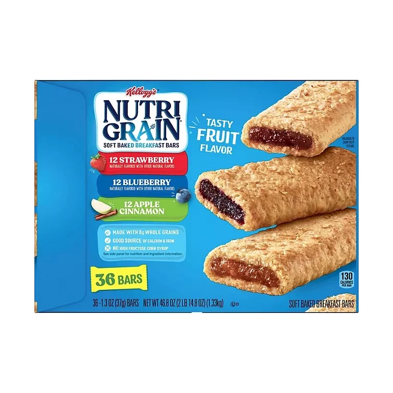 Kellogg's Nutri Grain cereal bars are among the best-selling cereal bars on the market due to the quality ingredients and delicious flavor. Each bar contains dietary fiber, zero trans-fat and zero cholesterol. Kellogg's Nutri Grain soft baked breakfast bars contain only 130 calories each–a tasty addition to any diet.