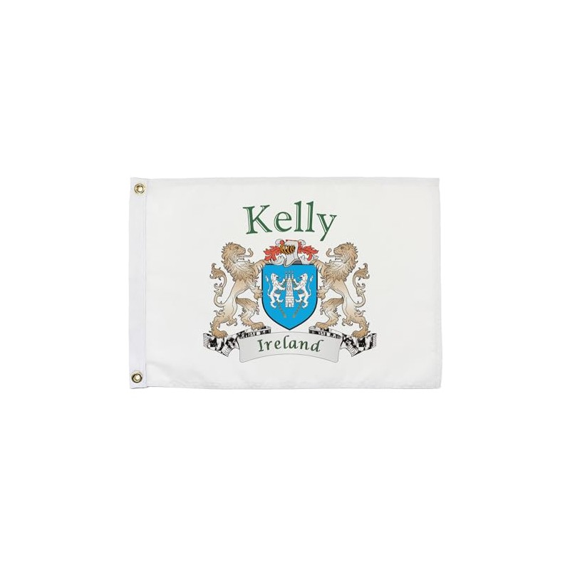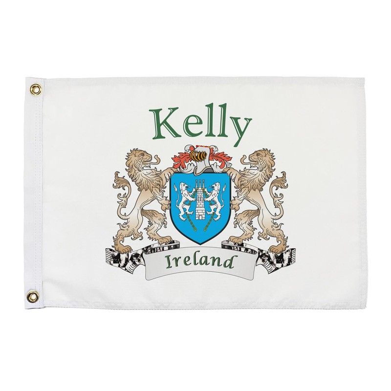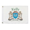 - Kelly family surname, crest, and coat of arms printed on one side of the flag.