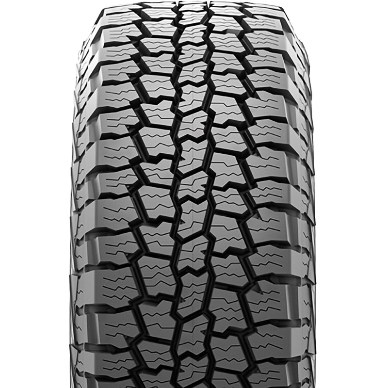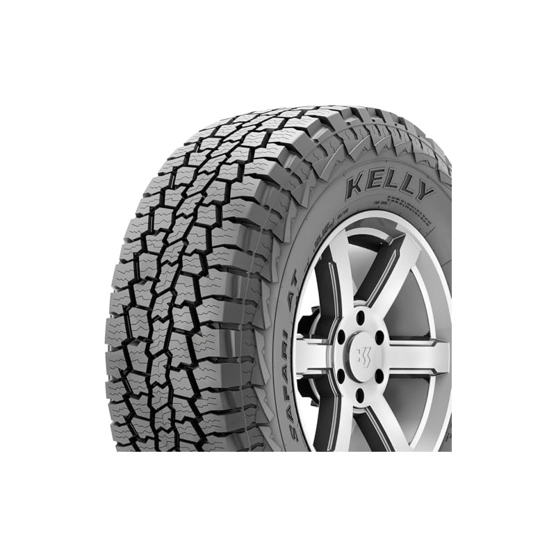 The Kelly Safari A/T is an all terrain, all weather tire made for light trucks and SUVs. Kelly offers a 55,000 mile treadwear warranty with this model. It is winter weather certified with the 3PMS symbol. The ideal tread pattern and the special silica compound improve the model’s performance on soft, loose, and uneven surfaces. The self-cleaning nature keeps the footprint clean. Excellent steering responsiveness and driving stability are guaranteed with this tread design and its continuous surface contact. Excellent all weather traction and hydroplaning resistance is guaranteed with this tire. The Kelly Safari A/T upgrades its load and driving durability, thanks to the strengthened structure and the special silica compound.