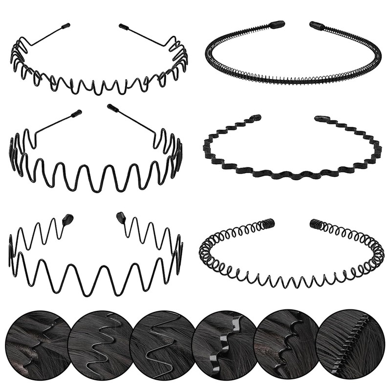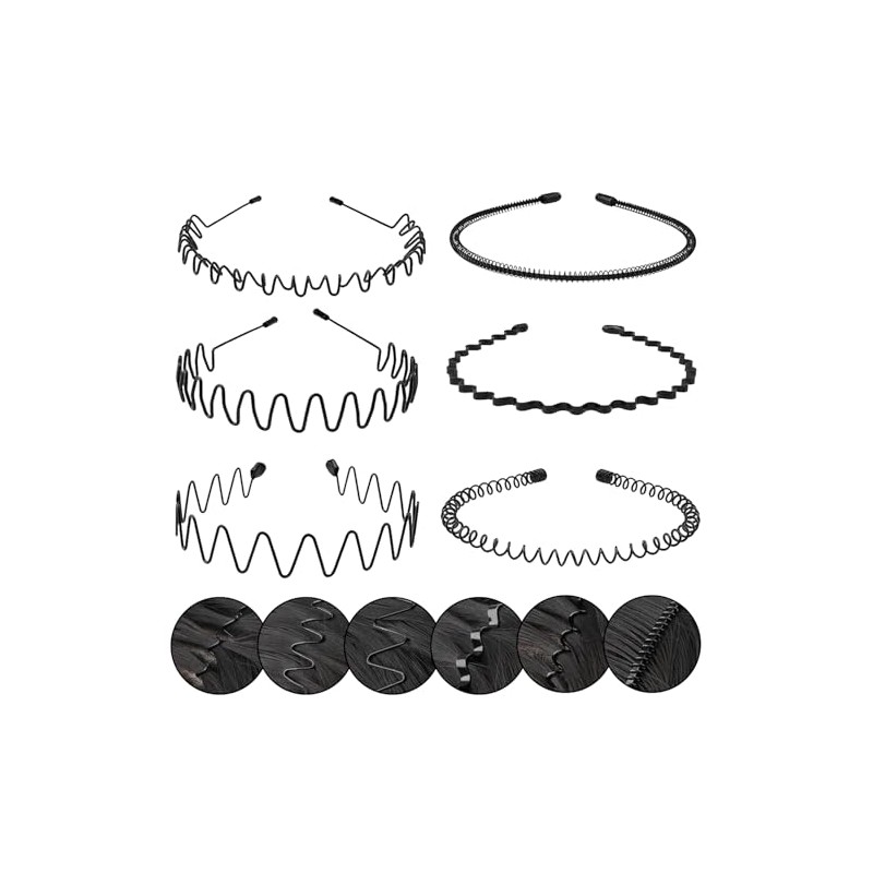 KELUBATU Metal Headbands for Man, Unisex Black Wavy & Smooth Headbands for Women, Non-Slip Elastic Hair Bands for Sports, Gym, Yoga, and Daily Use. (6 pack)