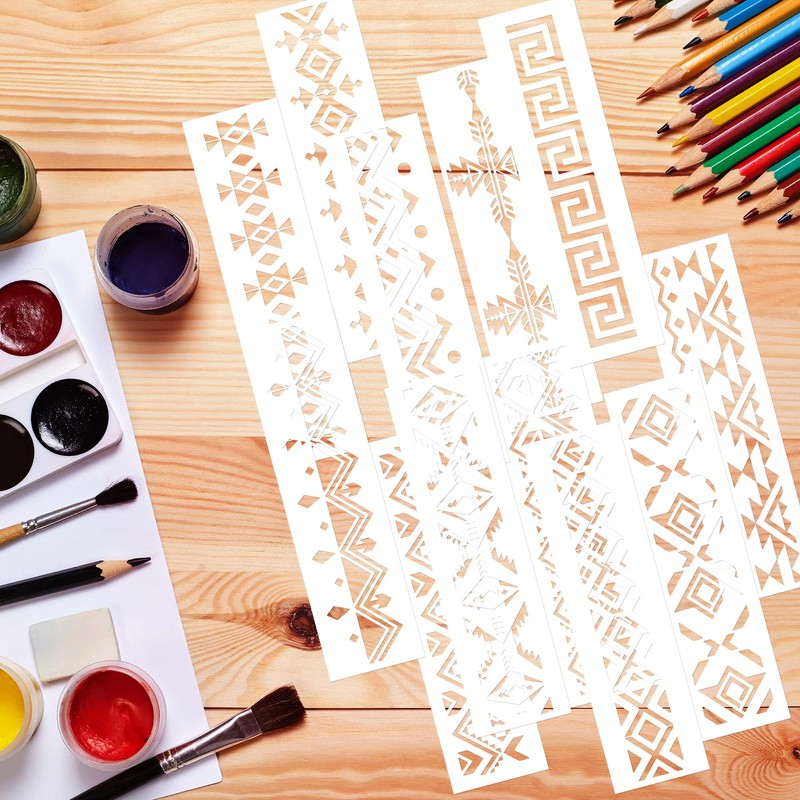 • What's in Package: You will receive 12 pieces of folk aztec stencils for painting. They are about 11*3 inches in size, you can use them making various painting craft, like cream cake decor or gift wrap decor, or you can use them painting on cupboard etc.