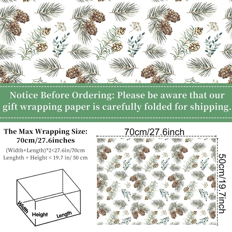- Paper Size: These hunter green Christmas wrapping paper size is about 50 cm x 70 cm, or 19.68 x 29.55 inches. Sage green Christmas gift wrapping paper providing ample coverage for wrapping various gift sizes, from small surprises to larger presents