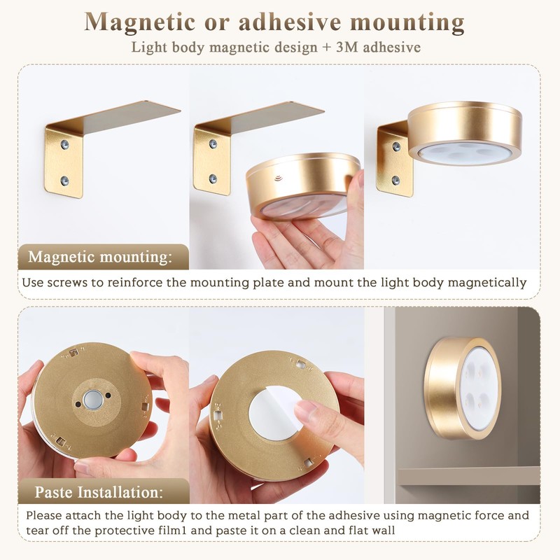 • 【Easy to Install】This LED wall lights comes with a magnetic fixture and strong 3M adhesive. The package comes with all the necessary accessories for installation, you just need to use the expansion screws to fix the iron plate on the wall and then use the magnetic hockey puck light to fix it on the iron frame, it is very easy to use.3M adhesive can be used in cabinets or closets!