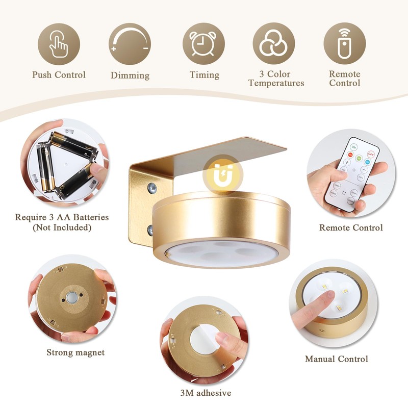 • 【Magnetic Design & Electromagnetic Drive】Gold wireless Picture Light features a magnetic attachment structure that makes it easy to remove and replace batteries. Picture light is powered by 3 AA batteries (batteries not included). Run time 30-60 hours (Rechargeable AA batteries recommended)