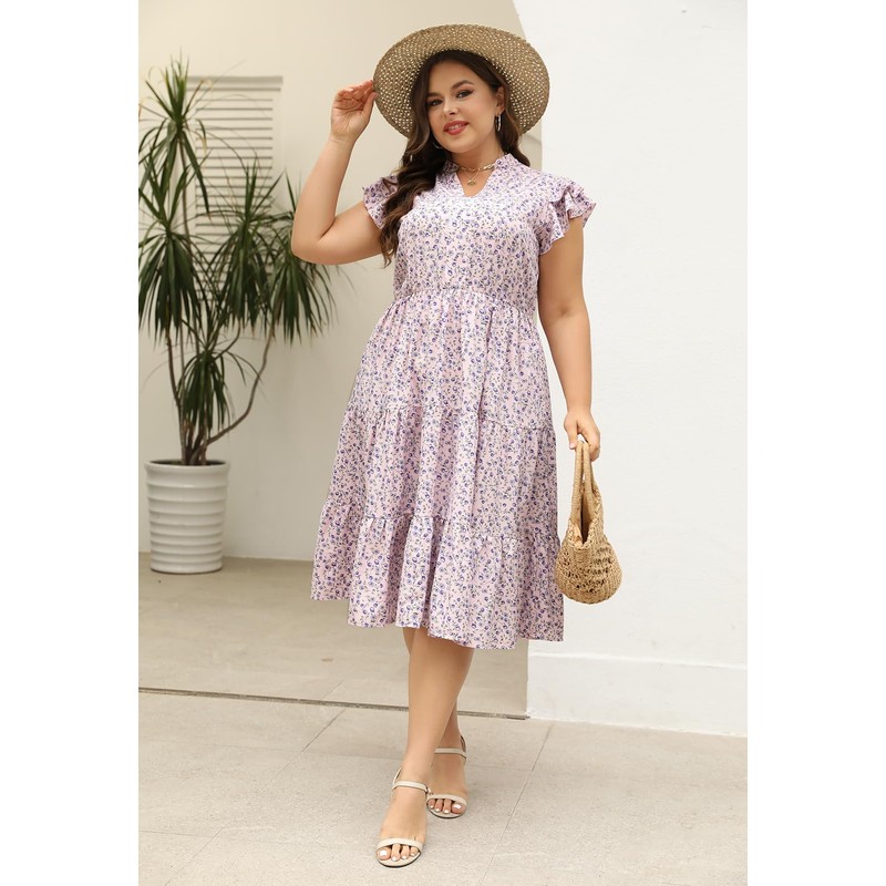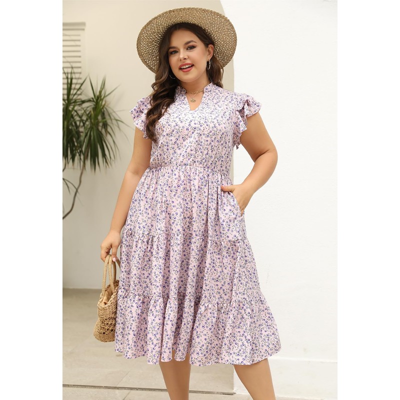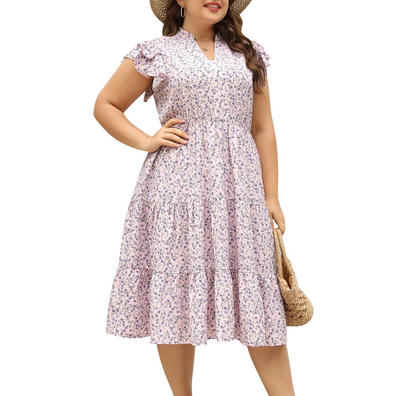 Keluummi Plus Size Wedding Guest Midi Dresses for Curvy Women, Summer Casual Floral Short Sleeve A Line Sundress with Pockets(22 Plus, 03 - Pink Floral)