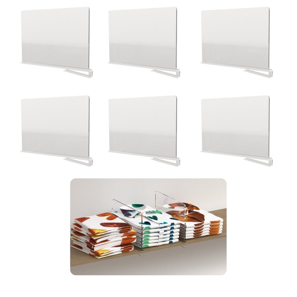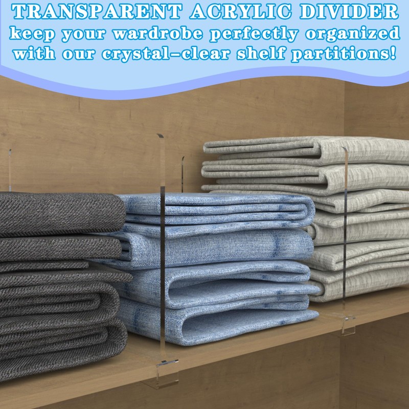 - Maximize Closet Space Our 6-pack acrylic shelf dividers efficiently separate clothes, purses, and sweaters, creating designated sections for quick access. Perfect for vertical shelves, pantries, and wooden cabinets.