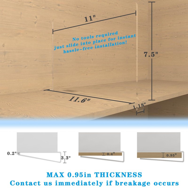 - Tool-Free Installation & Non-Slip Design Simply slide these dividers onto shelves (0.4-0.95 inches thick). Reinforced clips and non-slip pads ensure stability while protecting surfaces from scratches.