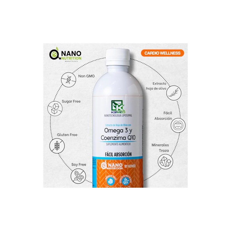 KEMED Omega 3 Y Coenzima Q10 Con Minerales Traza y Extracto de Hoja de Olivo Nanotecnologa Liposomal Suplemento de Fcil Absorcin 480 Ml Nano...