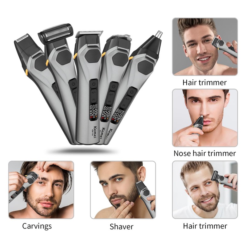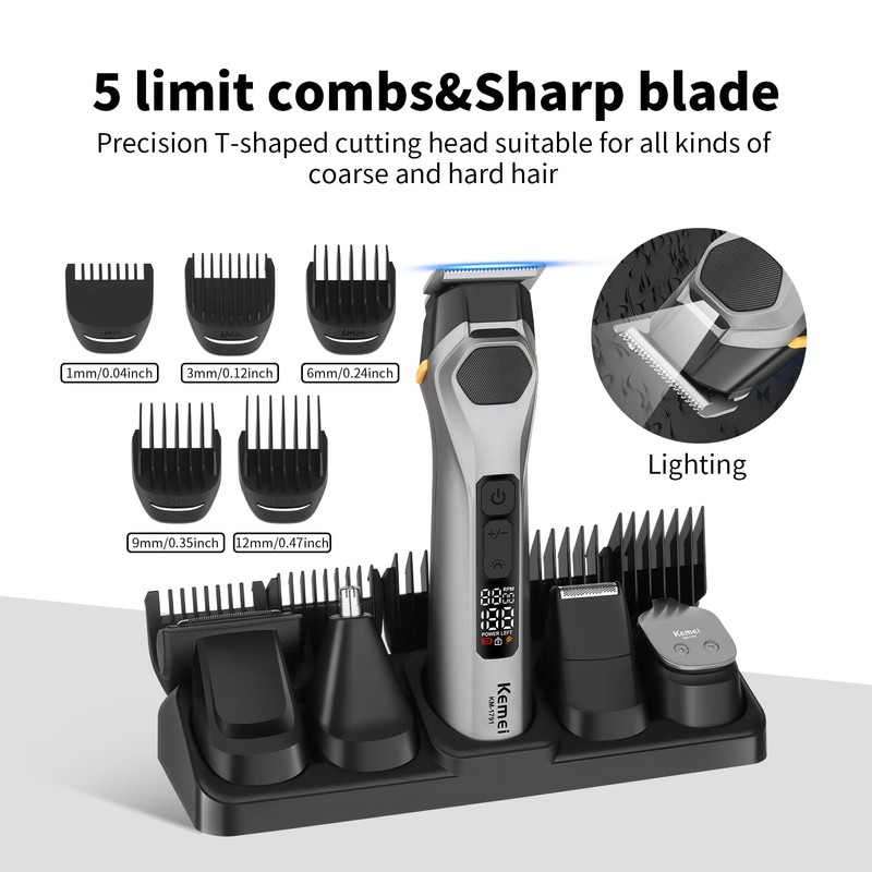 - 5in1 Professional Men's Hair Trimmers:The hair clipper kit comes with basic accessories, 1 comb, 1 cleaning brush, From sharp beard lines and nose, ear detailing to full-body grooming trimming and includeswith 5 limiting combs (1,3,6,9,12)mm for Perfectly grooms most body hair