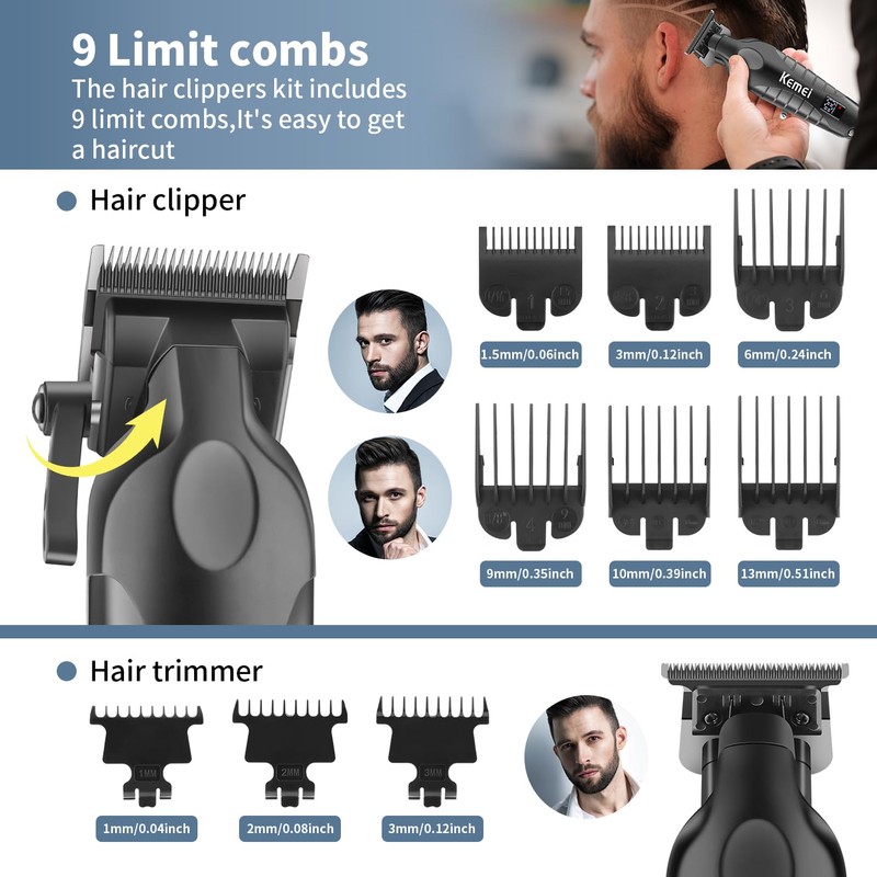 - 【Upgrade Package & Adjustable Lever】This KEMEI hair cutting set includes everything you need, with an efficient large hair cutting machine equipped with an adjustable lever that allows users to freely set the blade spacing. Not only that, it is also equipped with 9 sizes of limit combs: 1.5mm, 3mm, 4.5mm, 6mm, 10mm, 13mm for hair clippers, 1mm, 2mm, 3mm for trimmers, providing more length options. What’s more, the shaver adopts a double sharp foil design, with a lightweight and skin friendly blade mesh structure, particularly adept at handling thick, short, or lush hair and beard.