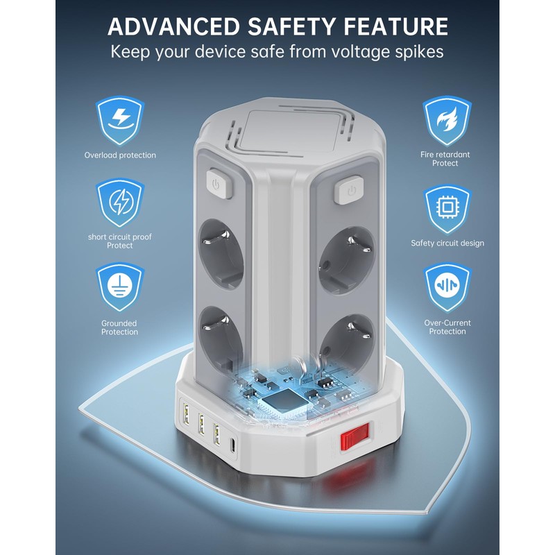 • ??5M Verl?ngerungskabel??Mit der steckdosenleiste 1berspannungsschutz mit 5M-Verl?ngerungskabel k?nnen Sie das andere Ende des Sofas problemlos umgehen. Diese steckdosenleisten verf1gt 1ber ein steckdosen tower design geeignet f1r Wohnzimmer, Schlafzimmer, Computertisch, B1robereich usw.