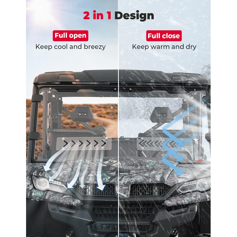 - 2-in-1 Windshield: Perfect for year-round riding, the KEMIMOTO UTV windshield doubles as a vented front windshield and a full windshield. The adjustable sliding vents provide refreshing airflow in the summer and can be closed to block wind during the winter