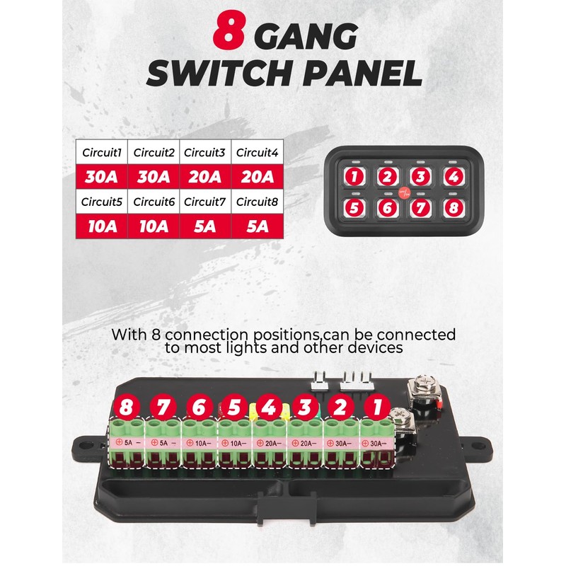 • Convenient 8-in-1 Switch Panel: KEMIMOTO 8 gang switch panel is universal for most vehicles. Operating Voltage: DC 12-24V, Max Current: 60A, Rated Voltage: 12V 20A / 24V 10A; Operating at 12 Volts: Max Power Rating of 600W, operating at 24 Volts: Max Power Rating of 1200W; Operating Temperature: -40℉ - +221℉