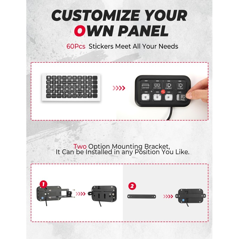 With its electronic relay system, you can count on efficient and reliable operation every time. Not only is it compatible with cars, UTVs, trucks, Wrangler, and RZR X3, American LandMaster L3 L4 LS455 4x4 series, but it also offers universal compatibility for most vehicles. But that's not all - our switch panel is equipped with triple protection to ensure the safety of your vehicle and electrical system. With 25% increased sensitivity, you can easily control your vehicle's accessories with precision. Additionally, it boasts a 30% extended lifespan compared to ordinary control panels, having a more reliable performance. Say goodbye to frequent replacements and enjoy a durable switch panel that won't let you down