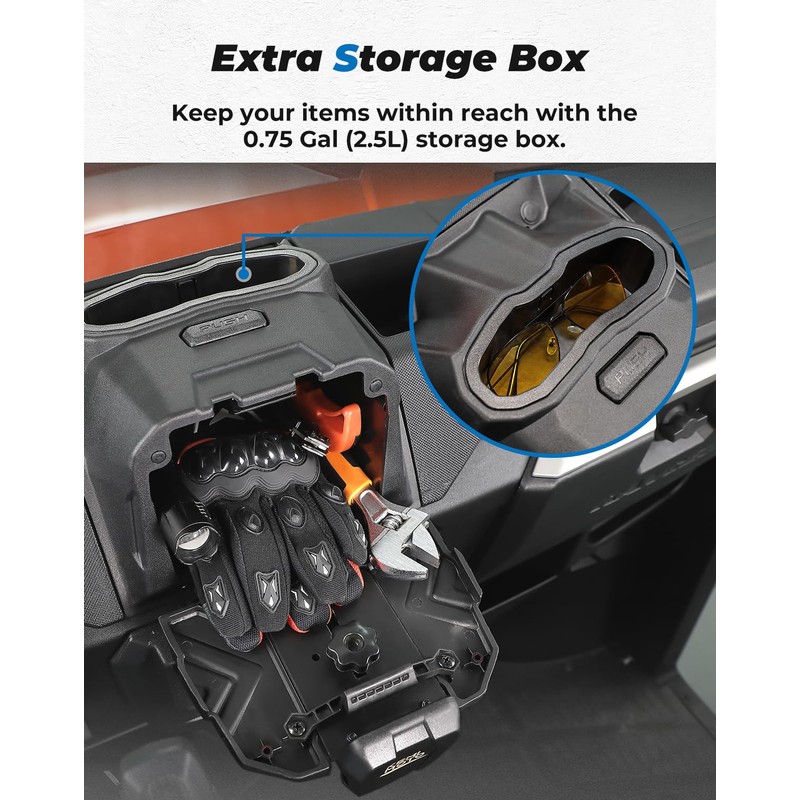 - Double Storage Box: Keep your items within reach with the 0.75 Gal (2.5L) hidden storage box located above the dashboard that doesn't take up much space. Depending on your demands, the double storage box can reasonably place your sunglasses, gloves, keys, wallets, and other personal items.