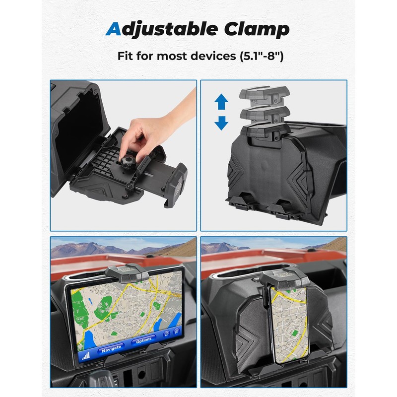 - Adjustable clamp: Securely hold your tablet, mobile phone, and navigator in place with KEMIMOTO's adjustable clamp that is compatible with most devices (5.1"-8"). The navigation holder is located above the UTV dashboard, allowing you to easily connect your device to the dashboard's power for charging.
